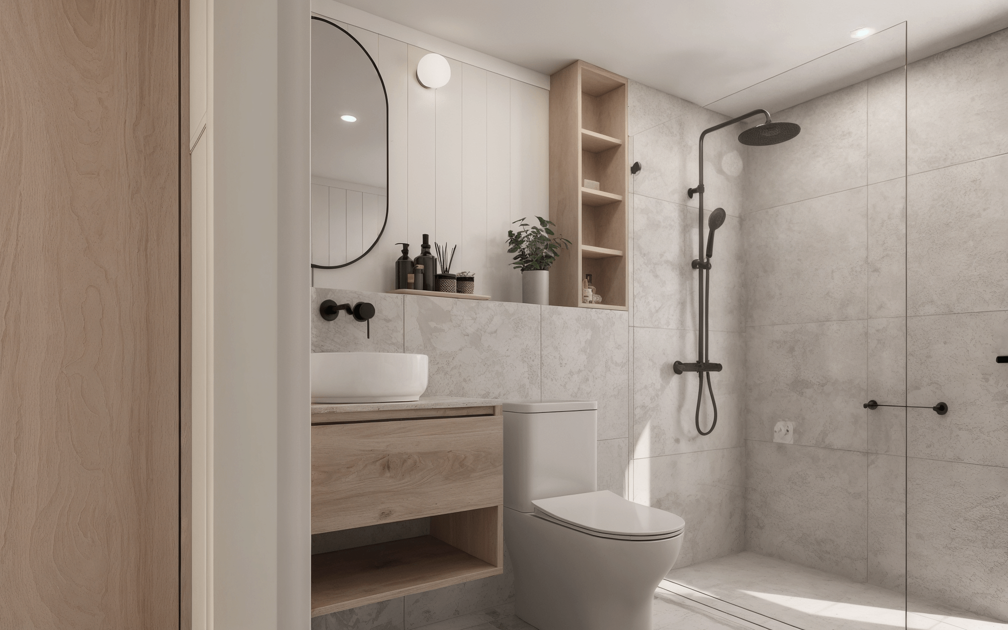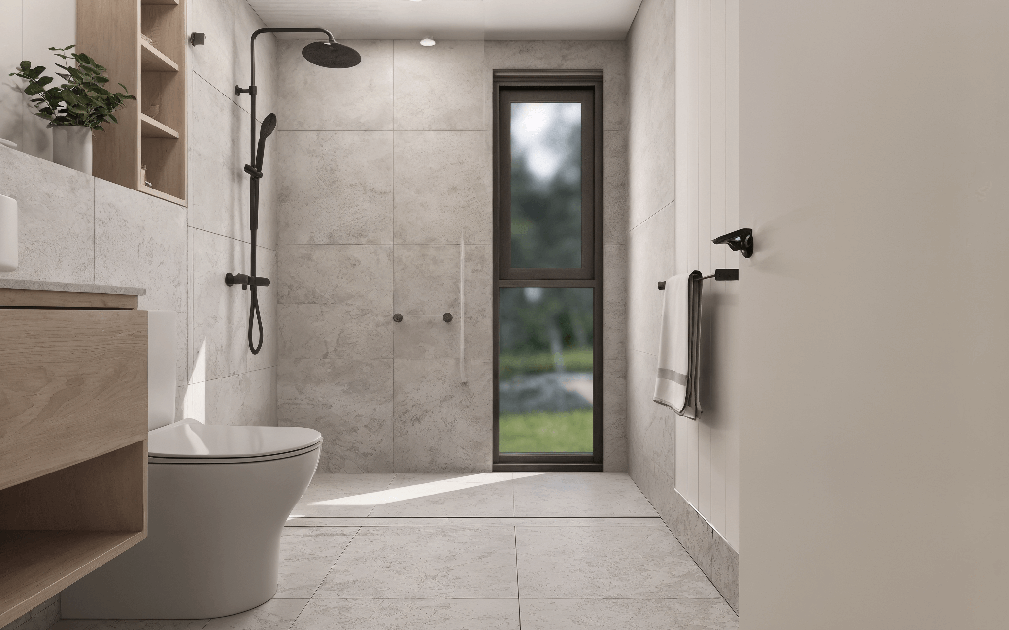 Bathroom: Vitrified porcelain tiles and painted fibrous cement panels